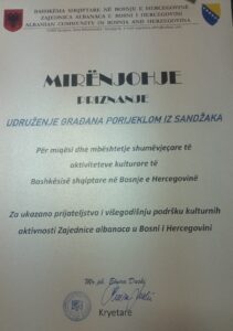 Tom prilikom, Albanska zajednica u Bosni i Hercegovini dodijelila je priznanje Udruženju, ističući dugogodišnju saradnju, prijateljstvo i zajednički doprinos kulturnim aktivnostima.