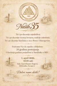 Sarajevo, 1. april 2026. – U svečanoj atmosferi, u prostorijama Gazi Husrev-begove biblioteke, obilježeno je 35 godina postojanja Udruženja građana porijeklom iz Sandžaka u Bosni i Hercegovini.