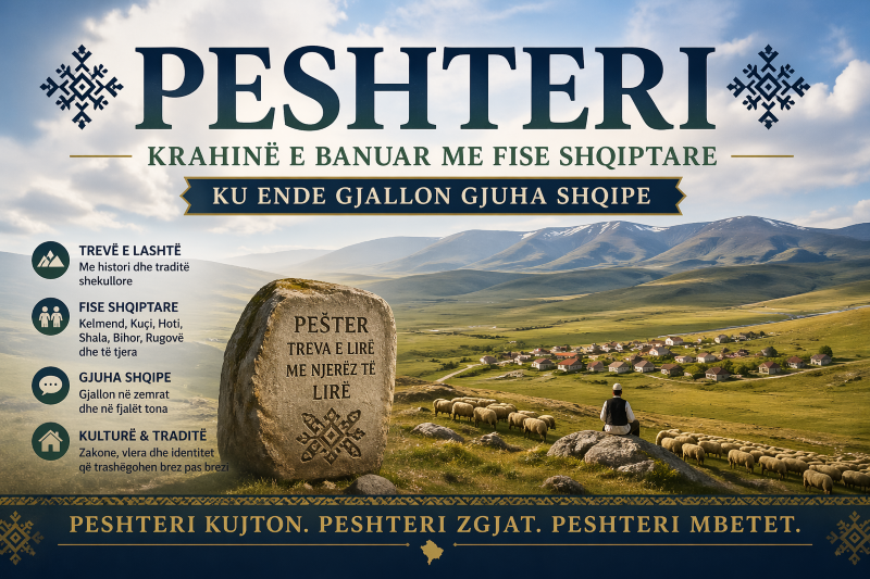 Edhe sot, në disa zona të kësaj treve, ruhen gjurmë të gjuhës shqipe, toponime të vjetra dhe kujtesa familjare për prejardhjen shqiptare të shumë fiseve. Në tekstin e tij interesant, autori Dr. Esad Kučević trajton emrin “Pešter” jo vetëm si term gjuhësor, por si identitet që zgjat në kohë.